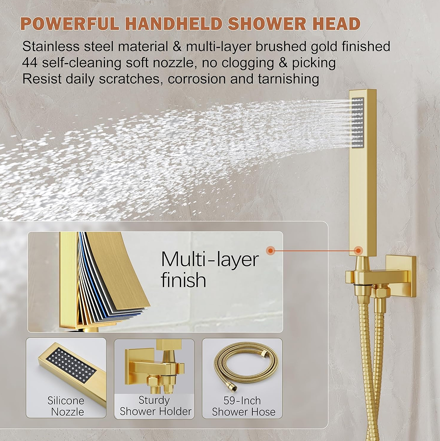 This integrated system combines an overhead shower and a handheld shower on a sliding bar. The sliding bar is made of aluminum alloy and allows for free adjustment of the handheld shower’s height. The manufacturing process includes a smooth track design and a locking mechanism for the sliding bar. This sliding bar design is particularly suitable for families with children or those who require seated showering, allowing for easy adjustment of the handheld shower to the appropriate height for precise rinsing, preventing splashing and water waste caused by an uncomfortable handheld shower height.