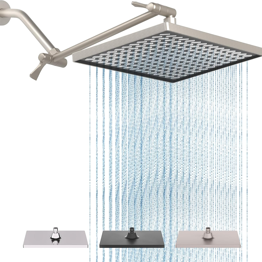 This set includes a rectangular overhead showerhead and a high-quality metal extension arm. The showerhead measures 300x200mm and features a modern design, while the extension arm is an 11-inch stainless steel tube. The manufacturing process includes bending and reinforcing the rectangular panel to prevent deformation. The rectangular spray pattern better conforms to the contours of the human body while standing, resulting in a more even water distribution. The set design ensures a perfect match between the extension arm and the showerhead, resulting in a stable structure after installation with no wobbling or leaks.